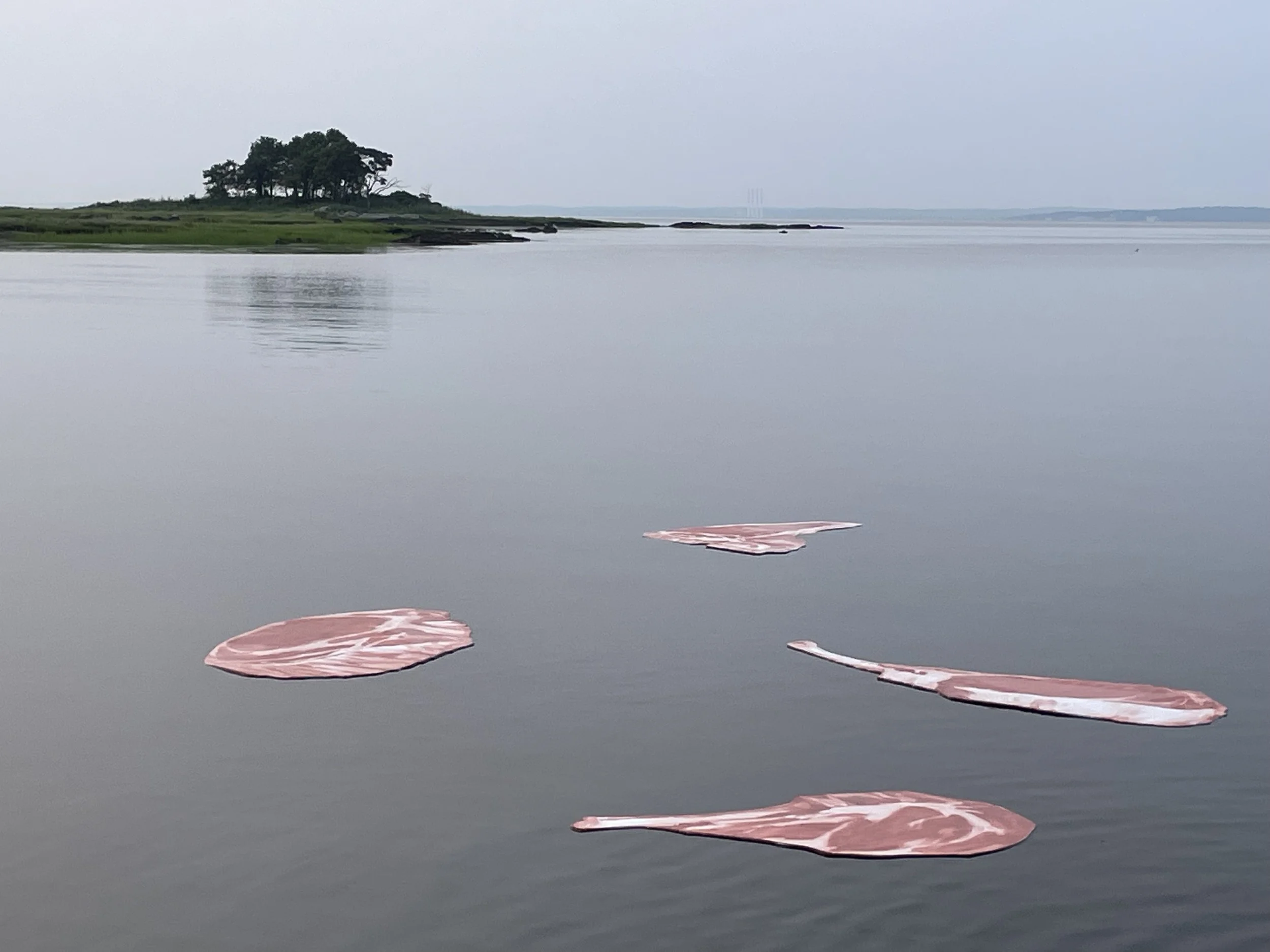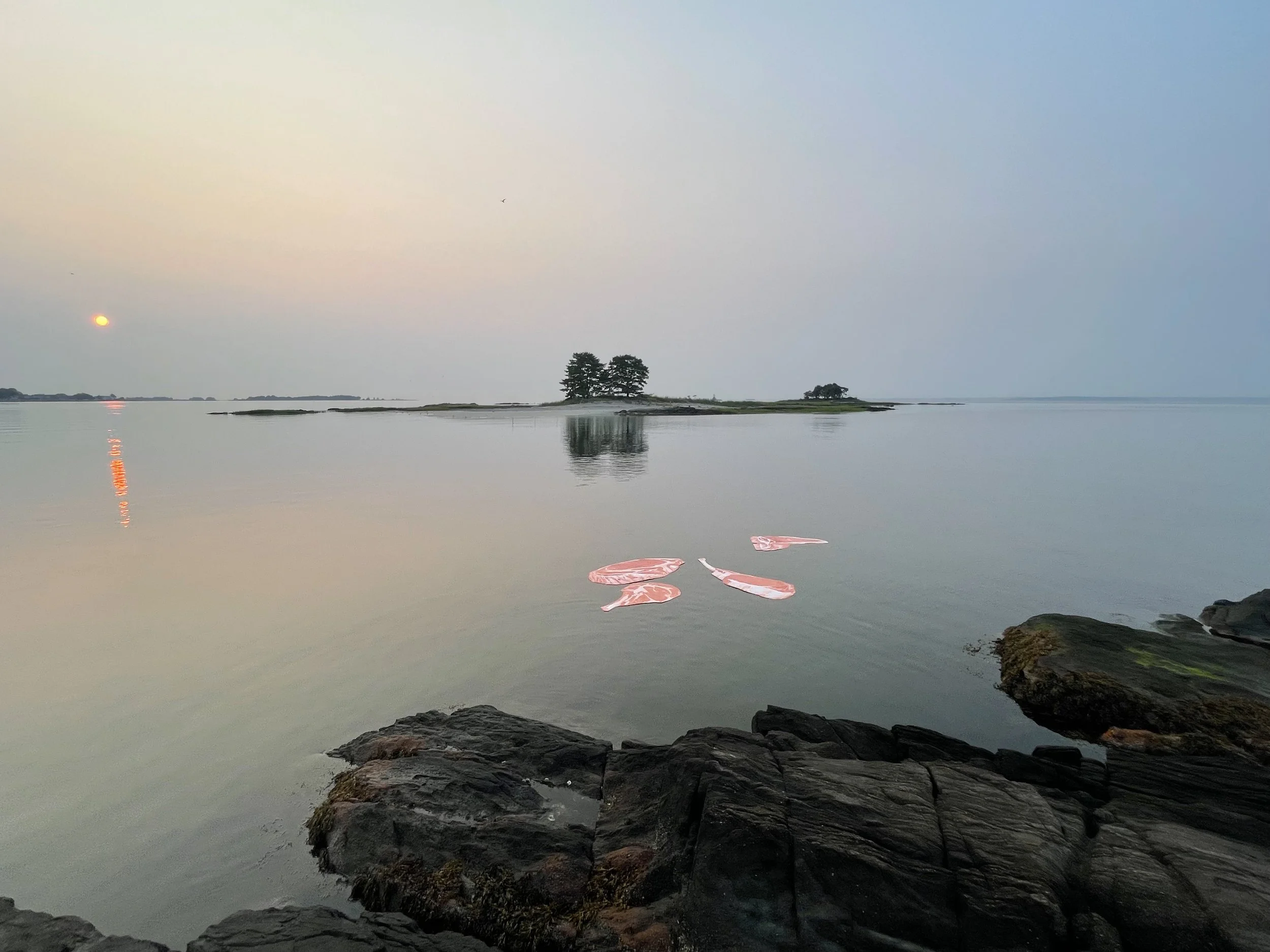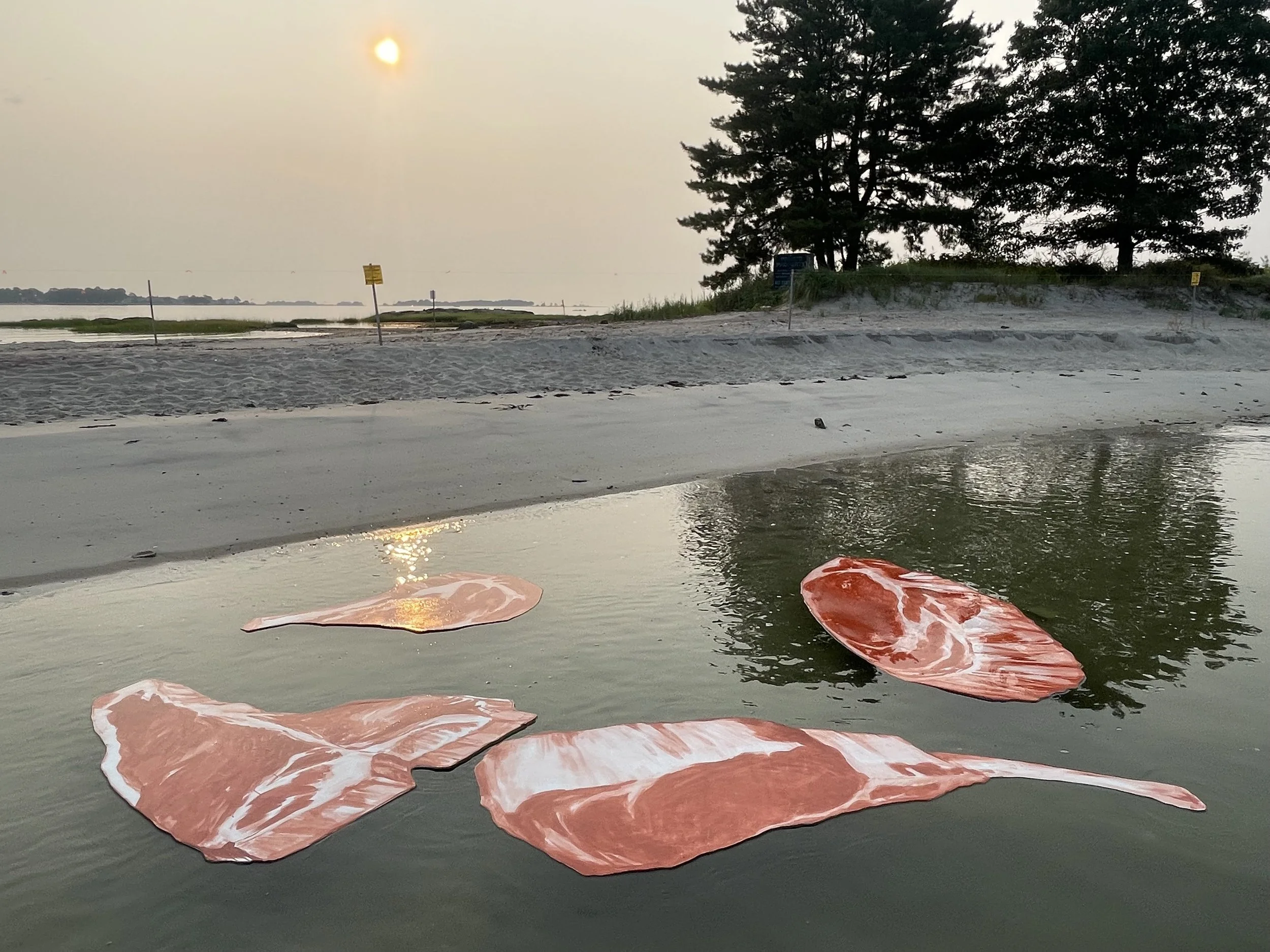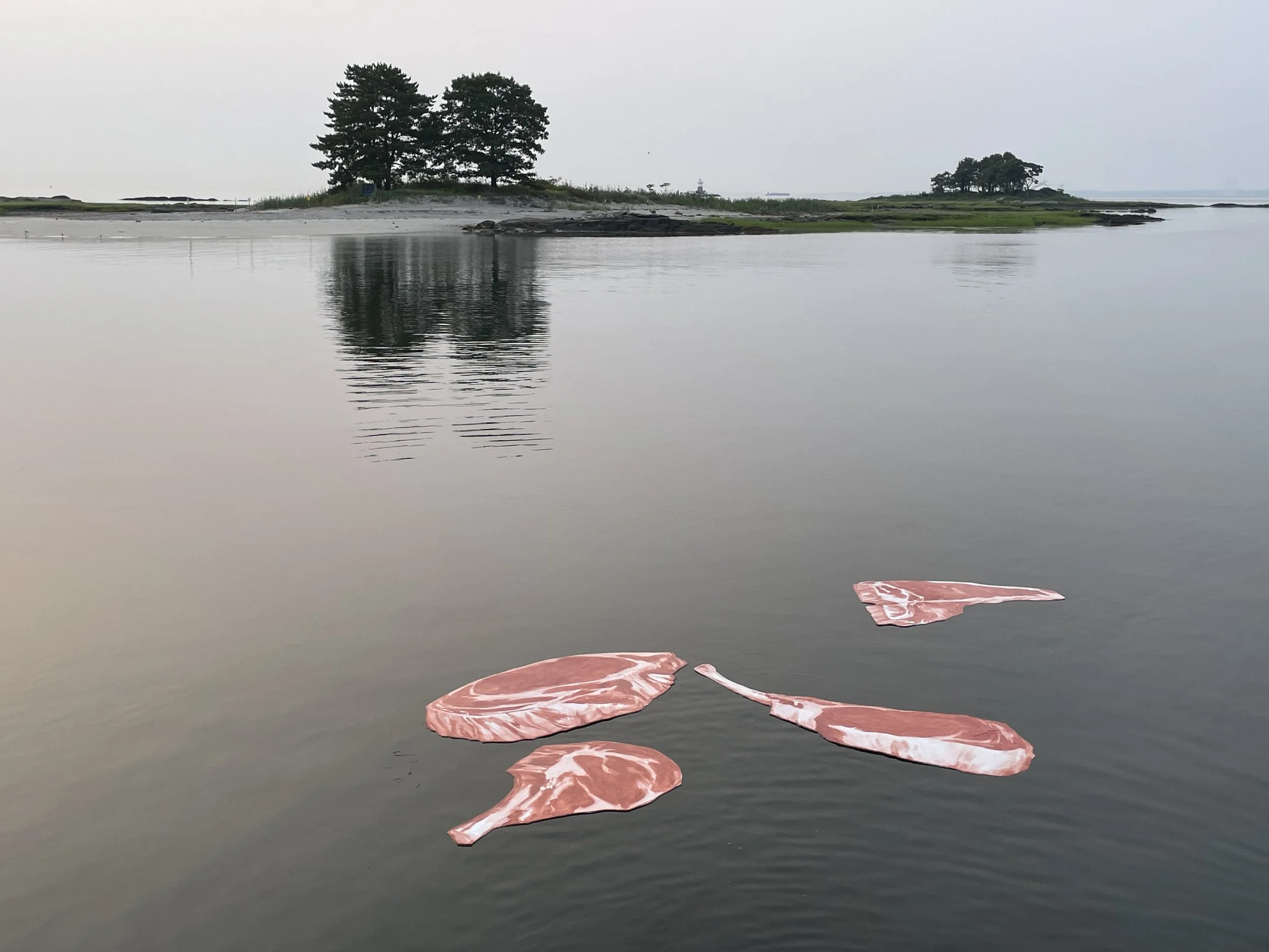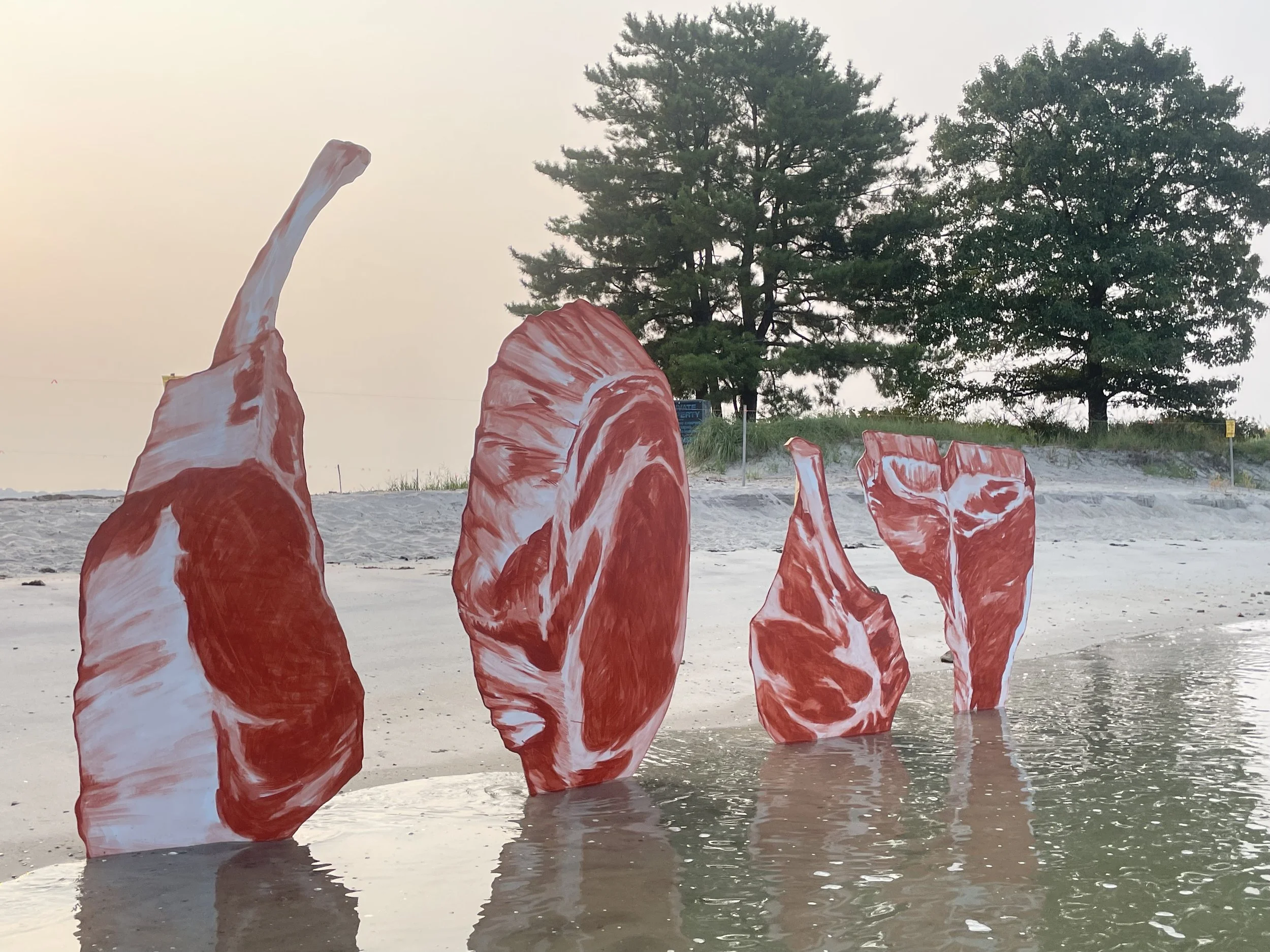 Four steaks, unmoored from their doomed destiny in time-space, float out to an island in Darien, CT, and erect themselves vertically on the shoreline. Perhaps they impelled by an epigenetic memory to relive the sandy crawl of the first terrestrial mammals. Or perhaps they are evincing a monument to a lost civilization that was fruitful and multiplied until it ate up the entire world.
